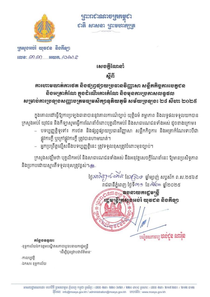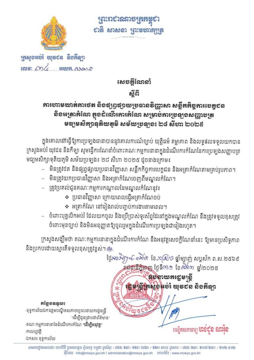 នៅព្រឹកថ្ងៃទី៣១ ខែសីហា ឆ្នាំ២០២៥នេះ ក្រសួងអប់រំ យុវជន និងកីឡា បានចេញសេចក្តីណែនាំ ស្តីពីការហាមឃាត់ការថត និងផ្សព្វផ្សាយប្រធានវិញ្ញាសា សន្លឹកកិច្ចការបេក្ខជន និងអត្រាកំណែក្នុងដំណើរការកំណែ សម្រាប់ការប្រឡងសញ្ញាបត្រមធ្យមសិក្សាទុតិយភូមិ សម័យប្រឡង៖ ២៨ សីហា ២០២៥ ហើយចំពោះអ្នកប្រព្រឹត្តល្មើសនឹងត្រូវទទួលខុសត្រូវចំពោះមុខច្បាប់៕