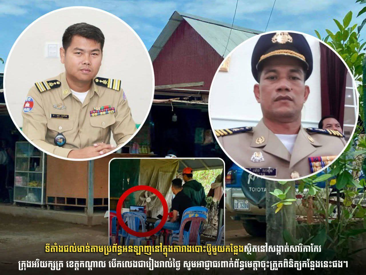 ប្រជាពលរដ្ឋរាយការណ៍ថា ទីតាំងជល់មាន់តាមប្រព័ន្ធអនឡាញមួយ កំពុងដំណើរការ នៅក្នុងតារាងបោះប៊ូលមួយកន្លែងស្ថិតនៅភូមិក្តីកណ្ដាល សង្កាត់សារិកាកែវ ក្រុងអរិយក្សត្រ ខេត្តកណ្ដាល ដោយបើកលេងជារៀង រាល់ថ្ងៃ ។ ទីតាំងនេះត្រូវប្រជាពលរដ្ឋមើលឃើញថាមានលក្ខណៈងាយស្រួលសម្រាប់អ្នកលេង។ ប្រជាពលរដ្ឋនៅតំបន់នោះ ស្នើអាជ្ញាធរពាក់ព័ន្ធមេត្តាចុះត្រួតពិនិត្យកន្លែងនេះផង។