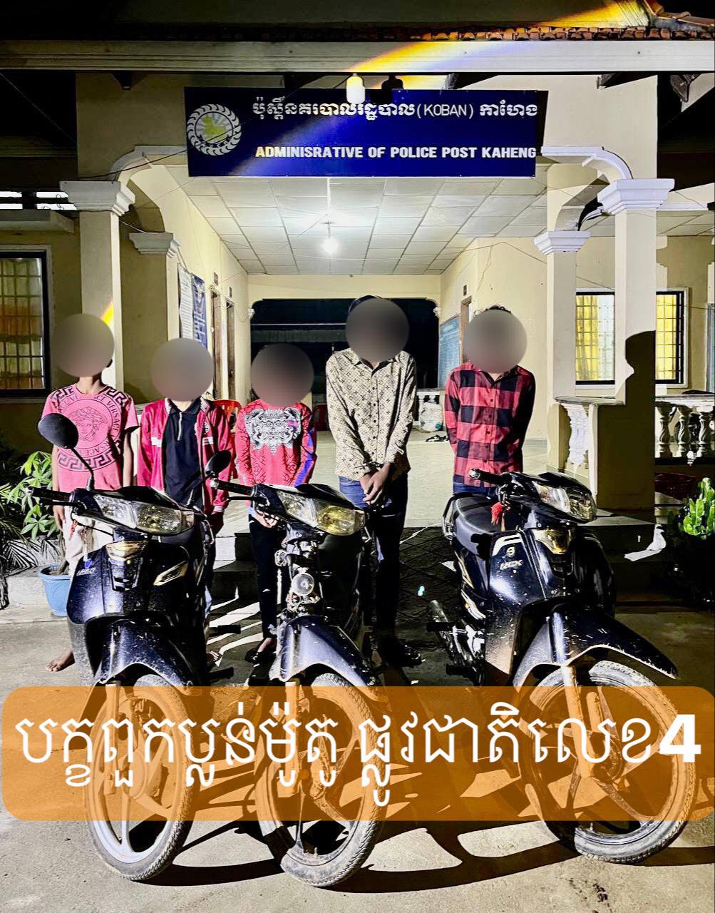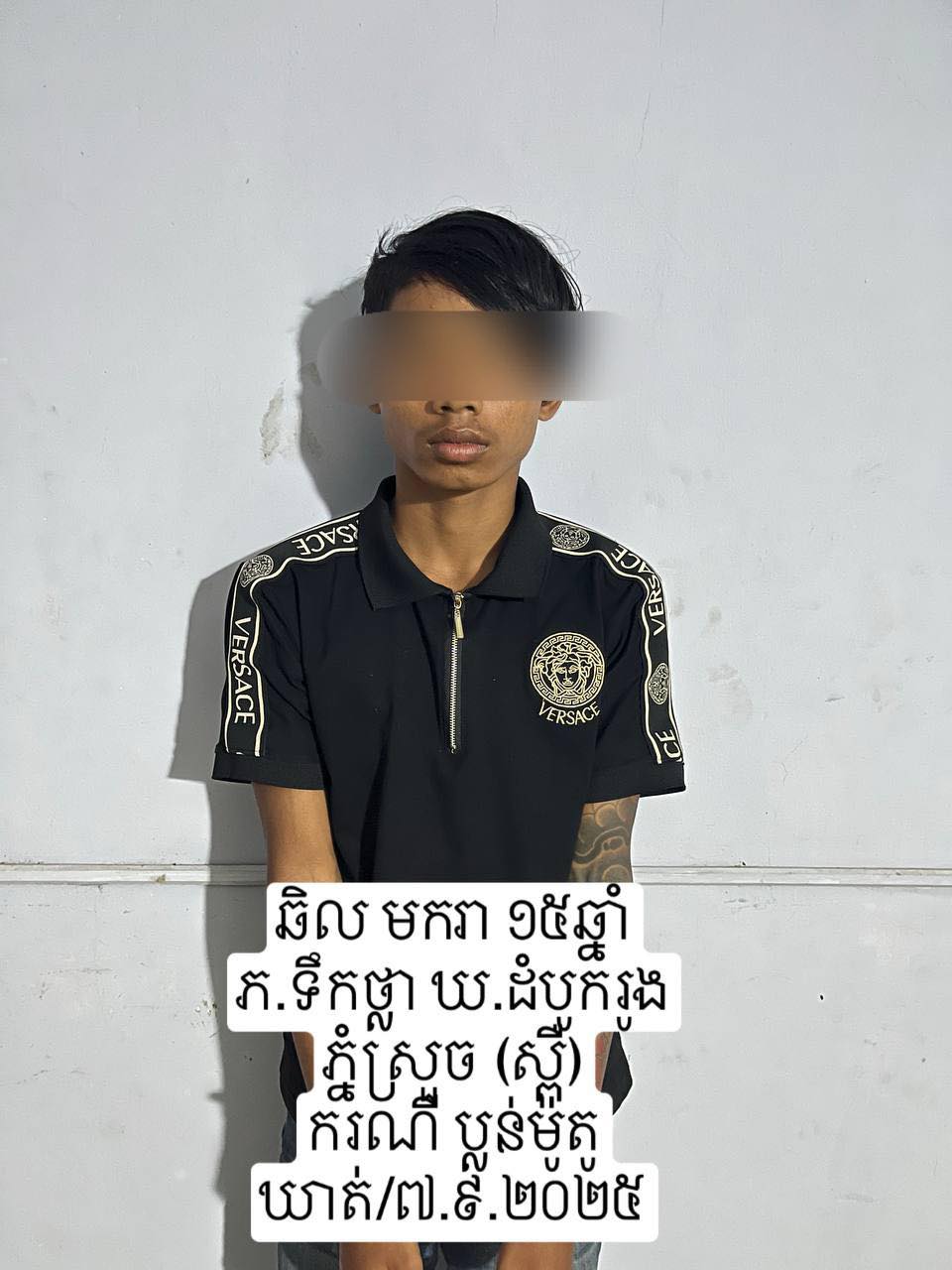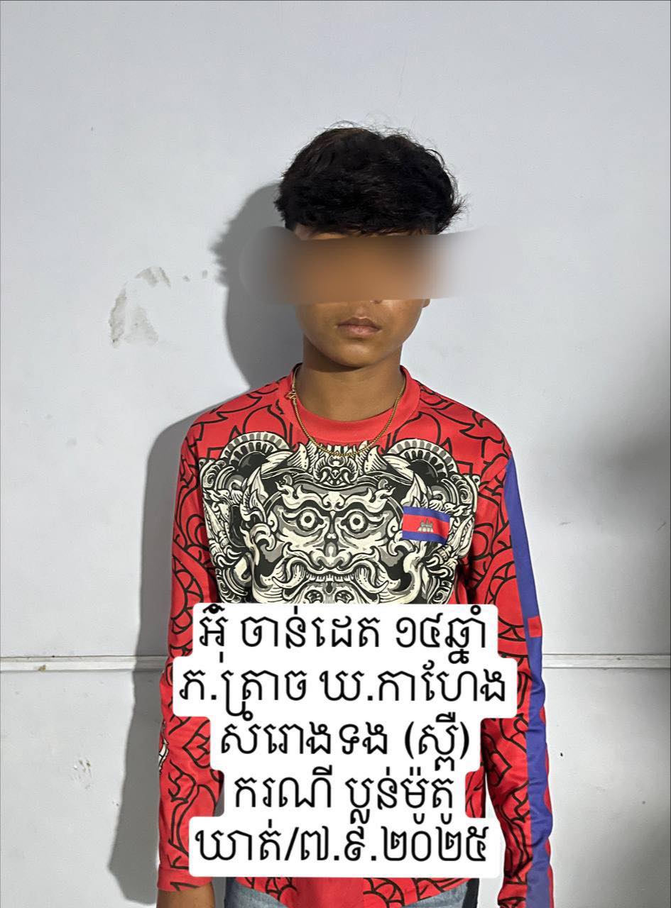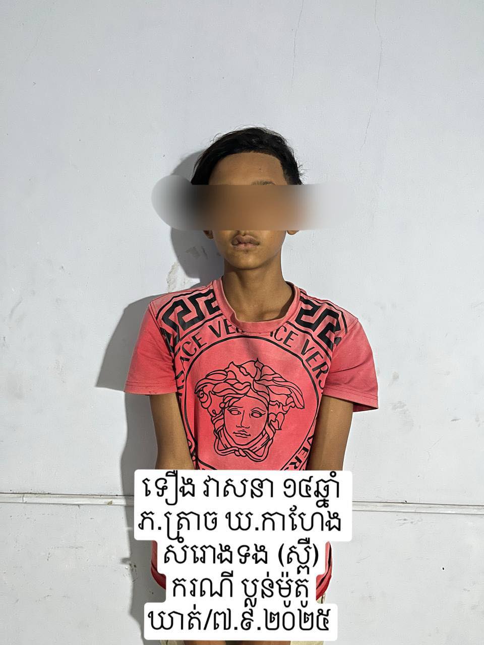៥-ឈ្មោះ ទឿង វាសនា ប្រុស ១៤ឆ្នាំ បក្ខពួកប្លន់ម៉ូតូខាងលើជាមុខសញ្ញាចាស់ធ្លាប់កាប់ប្លន់យកម៉ូតូកាលថ្ងៃទី៣១ ខែសីហា ឆ្នាំ២០២៥ ផ្លូវជាតិលេខ៤ គីឡូម៉ែត៦៧-៦៨នៅចំណុចភូមិត្រពាំងអត់ទឹកឃុំគីរីវន្ត ស្រុកភ្នំស្រួច។