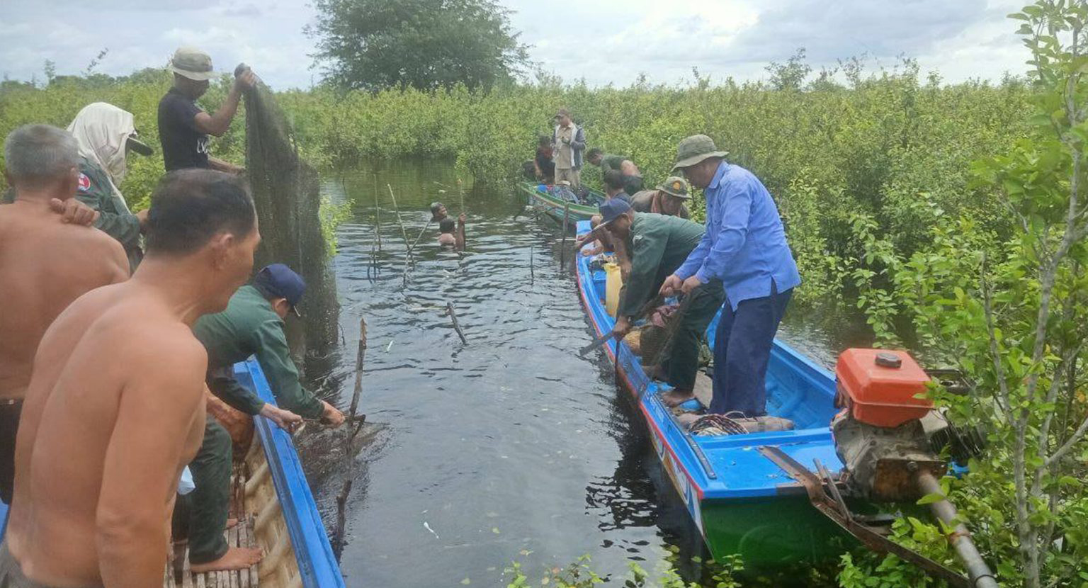 (បាត់ដំបង) ៖ នៅថ្ងៃទី១៧ ខែកញ្ញា ឆ្នាំ២០២៥ ដោយអនុវត្តតាមបទបញ្ជាដឹកនាំរបស់លោកឧត្តមសេនីយ៍ទោ ដាញ់ អេងប៊ុនចាន់ ស្នងការ នៃស្នងការដ្ឋាននគរបាលខេត្តបាត់ដំបង កម្លាំងអធិការដ្ឋាននគរបាលស្រុកមោងឫស្សី សហការជាមួយកម្លាំងសង្កាត់រដ្ឋជលផល, កម្លាំងបរិស្ថានស្រុកមោងឫស្សី, សហគមន៍នេសាទដូនទ្រី, សហគមន៍នេសាទម៉ាណោក និងសហគមន៍នេសាទកកោះ ដឹកនាំដោយលោក បឿន សុវណ្ណ អភិបាលរងស្រុកមោងឫស្សី បានចុះបង្រ្កាបបទល្មើសនេសាទ ០១លើក នៅចំណុច បឹងតាងហីងស្ថិតក្នុង ភូមិទួលព្រុំ១ ឃុំកកោះ ស្រុកមោងឫស្សី ខេត្តបាត់ដំបង មានចូលរួមកម្លាំងចម្រុះសរុបចំនួន ២១នាក់។