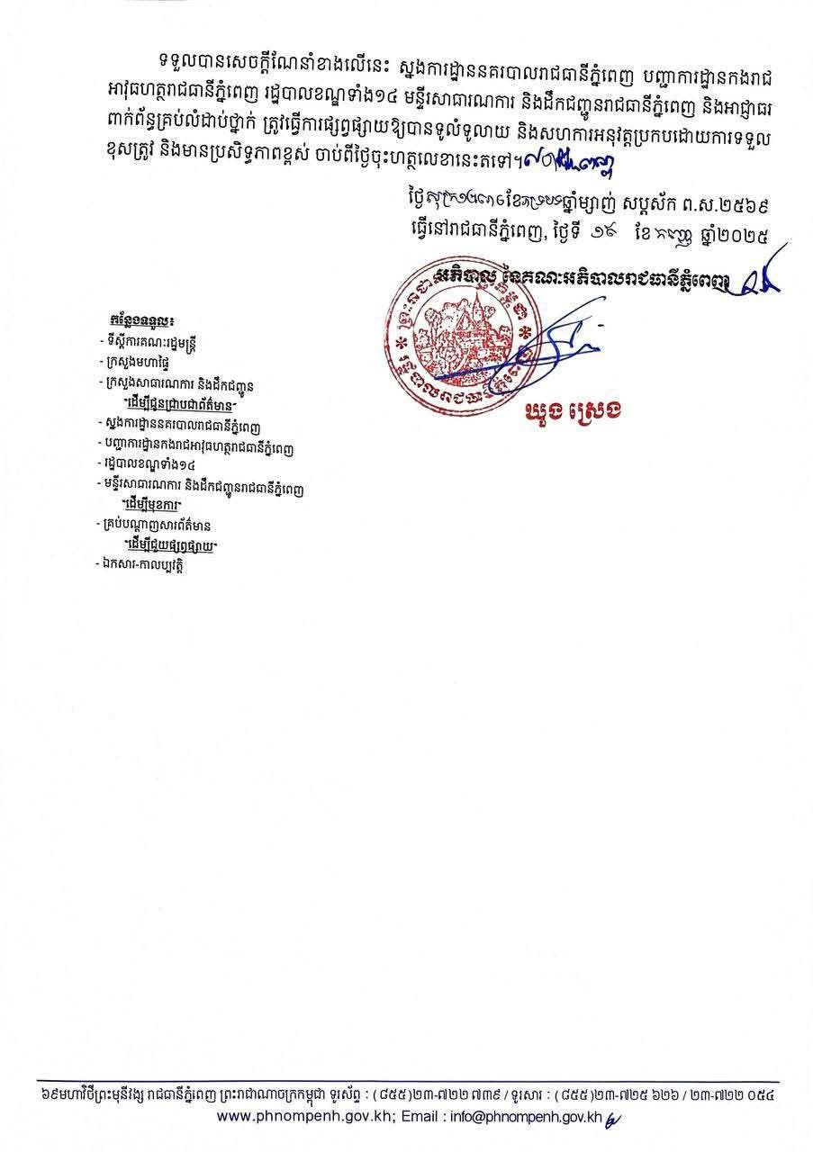 អាជ្ញាធររាជធានីភ្នំពេញ ហាមឃាត់ការធ្វើចរាចរណ៍ចំពោះយានយន្តធុនធ្ងន់គ្រប់ប្រភេទតាមបណ្តោយមហាវិថីសម្តេចតេជោ ហ៊ុន សែន (ផ្លូវ៦០ម៉ែត្រ) ដើម្បីជួយសម្រួលការកកស្ទះចរាចរណ៍ និងបង្ការការកើតមានគ្រោះថ្នាក់ណាមួយជាយថាហេតុ ដោយរដ្ឋបាលរាជធានីភ្នំពេញធ្វើការណែនាំដល់ប្រជាពលរដ្ឋទាំងអស់ ជាពិសេសម្ចាស់រថយន្តដឹកជញ្ជូនធុនធ្ងន់ ម្ចាស់ក្រុមហ៊ុន និងសហគ្រាស ដឹកជញ្ជូនតាមរយៈរថយន្តធុនធ្ងន់គ្រប់ប្រភេទ ត្រូវចូលរួមអនុវត្តសេចក្ដីណែនាំនេះ។