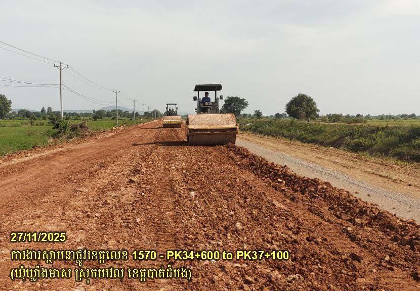 ២. បន្តការងារស្ថាបនាផ្លូវខេត្តលេខ ១៥៧០៖ ការងារកាយដីគ្មានគុណភាពលើតួថ្នល់ពង្រីក ដឹកចេញ និងកៀរកិនបង្ហាប់បាតគ្រឹះ ចាក់បំពេញដីល្បាយថ្ម ធ្វើគ្រឹះរង ចន្លោះគ.ម ៣៤+៦០០ ដល់គ.ម៣៧+១០០ ស្ថិតនៅក្នុងឃុំឃ្លាំងមាស ស្រុកបវេល។