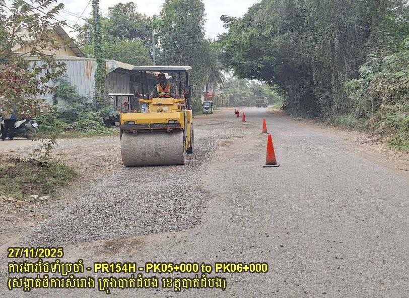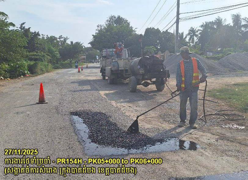 ៨. បន្តការងារថែទាំផ្លូវខេត្តលេខ ១៥៤H ៖ ការងារស្រោចកៅស៊ូ ជួសជុលលុបសំបុកមាន់ និងស្នាមប្រេះ ចន្លោះគ.ម០៥+០០០ ដល់គ.ម០៧+០០០ ស្ថិតនៅសង្កាត់ចំការសំរោង ក្រុងបាត់ដំបង។
