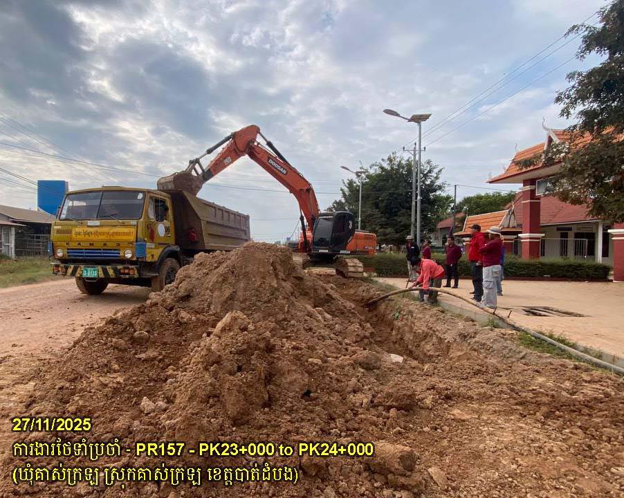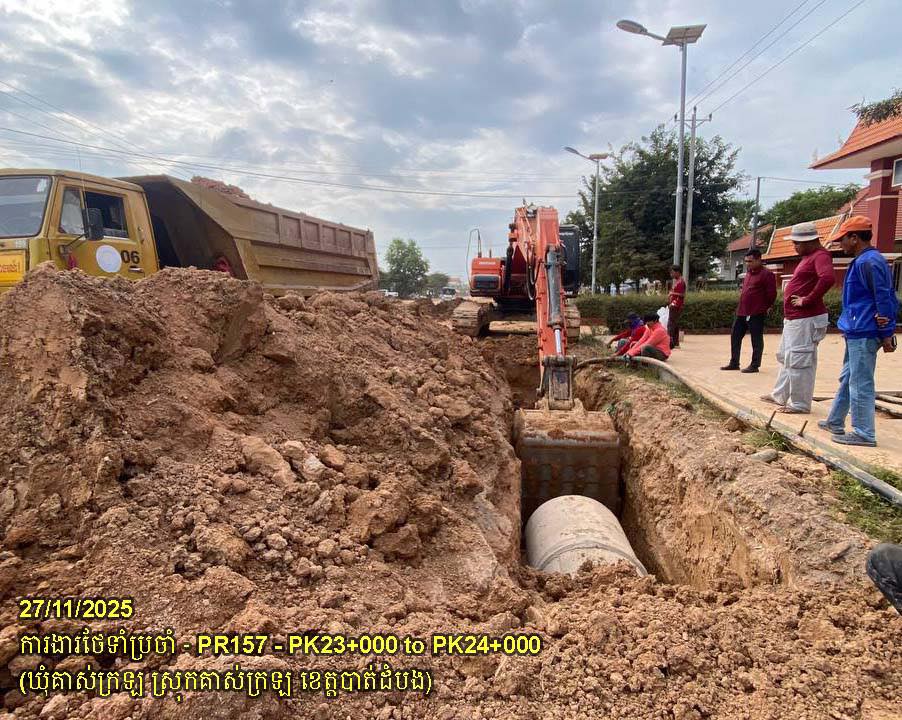 ១១. បន្តការងារថែទាំផ្លូវខេត្តលេខ ១៥៧ ៖ ការងារកាយប្រឡាយរំដោះទឹកបណ្តោយផ្លូវ ចន្លោះគ.ម២៣+០០០ ដល់គ.ម២៤+០០០ ស្ថិតនៅក្នុងឃុំគាស់ក្រឡ ស្រុកគាស់ក្រឡ។