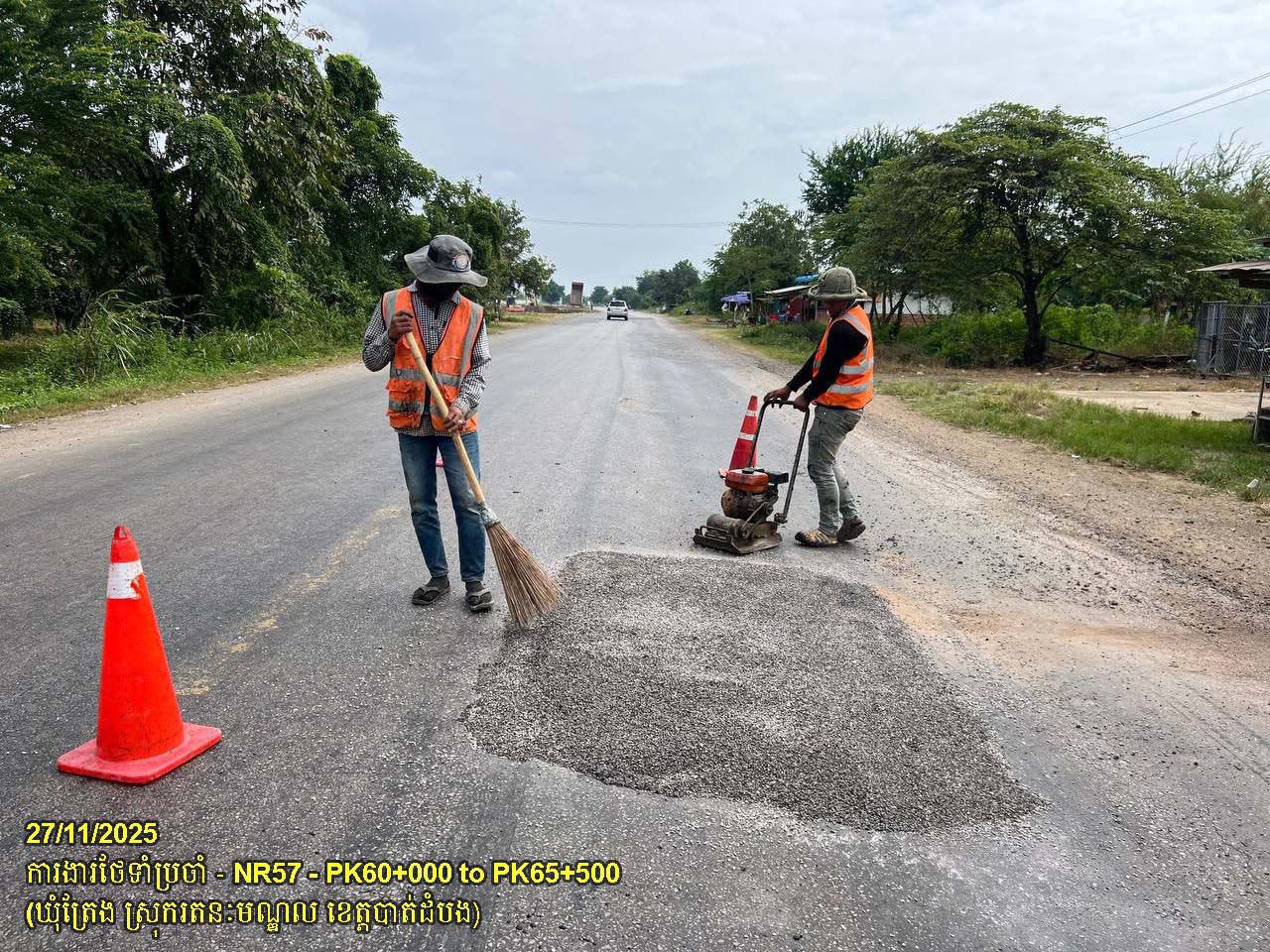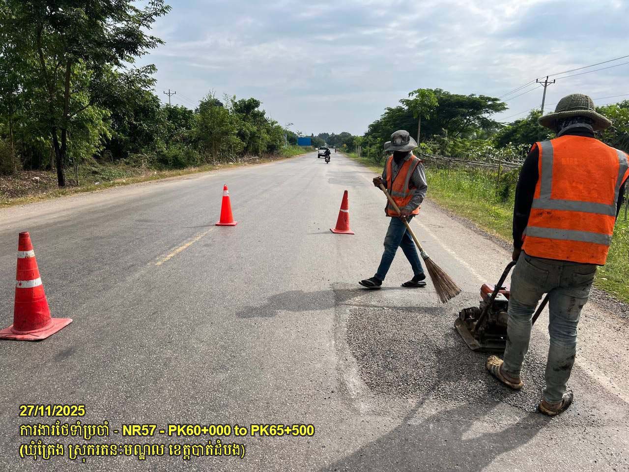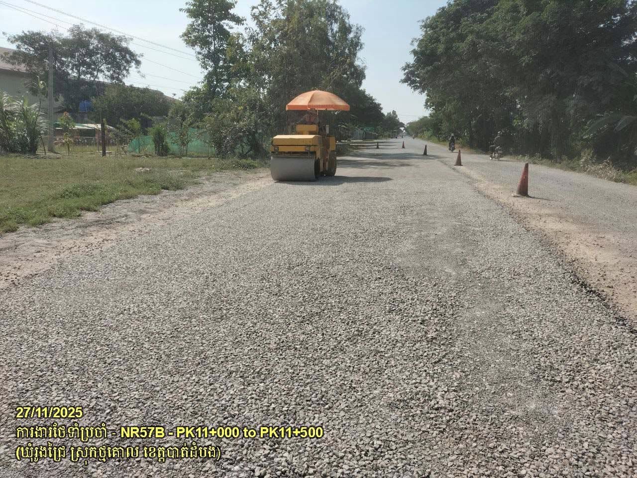 ៦. បន្តការងារថែទាំផ្លូវជាតិលេខ ៥៧B ៖ ការងារស្រោចកៅស៊ូ ជួសជុលលុបសំបុកមាន់ និងស្នាមប្រេះ ចន្លោះគ.ម១១+០០០ ដល់គ.ម១១+៥០០ ស្ថិតនៅឃុំរូងជ្រៃ ស្រុកថ្មគោល។