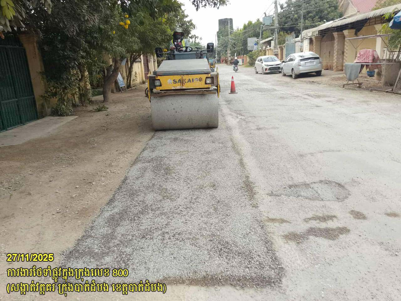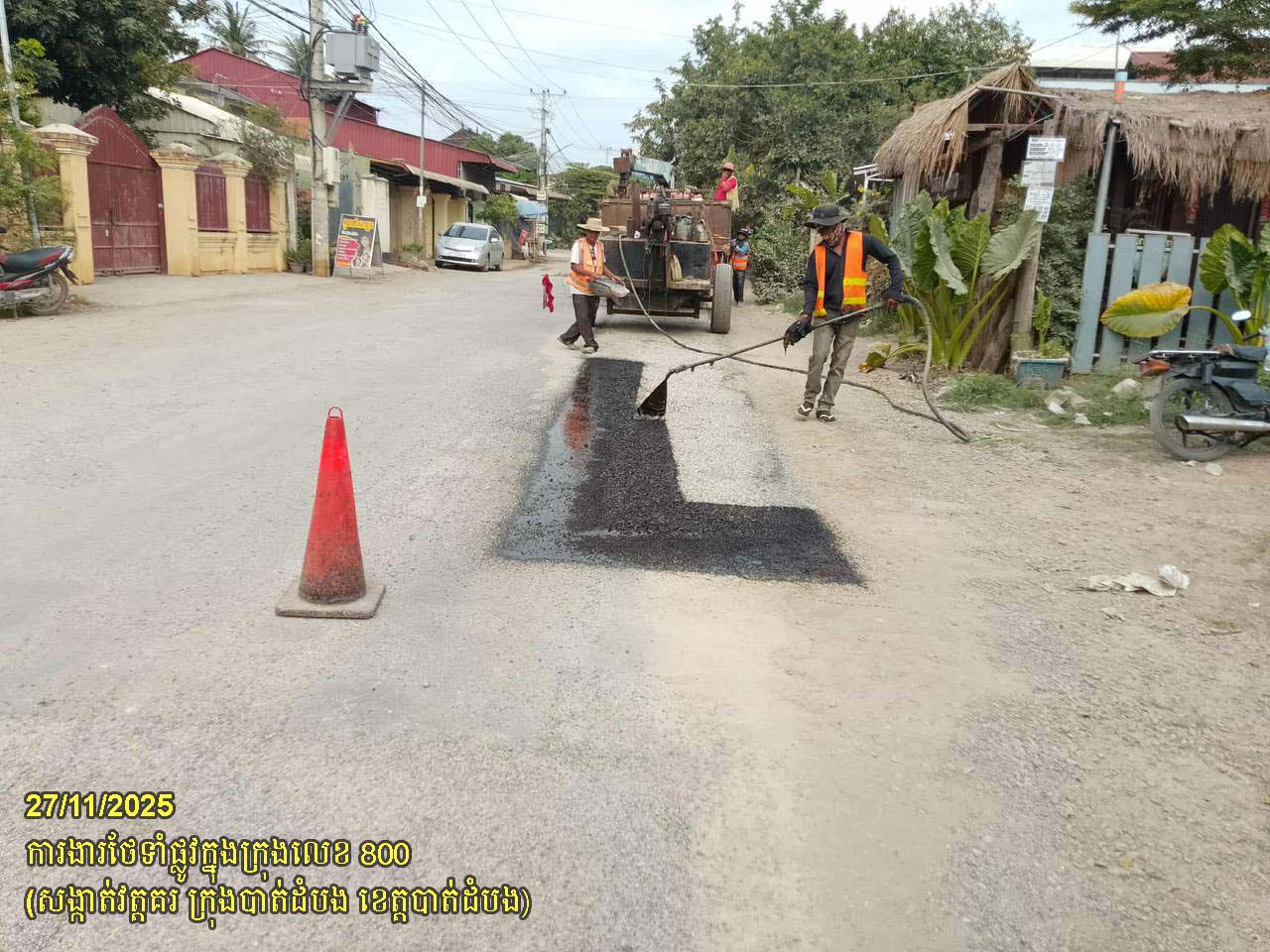 ១២. បន្តការងារជួសជុលផ្លូវក្នុងក្រុងលេខ ៨០០ ដោយស្រោចកៅស៊ូជួសជុលលុបសំបុកមាន់ និងស្នាមប្រេះ ស្ថិតនៅក្នុងសង្កាត់វត្តគរ ក្រុងបាត់ដំបង។
