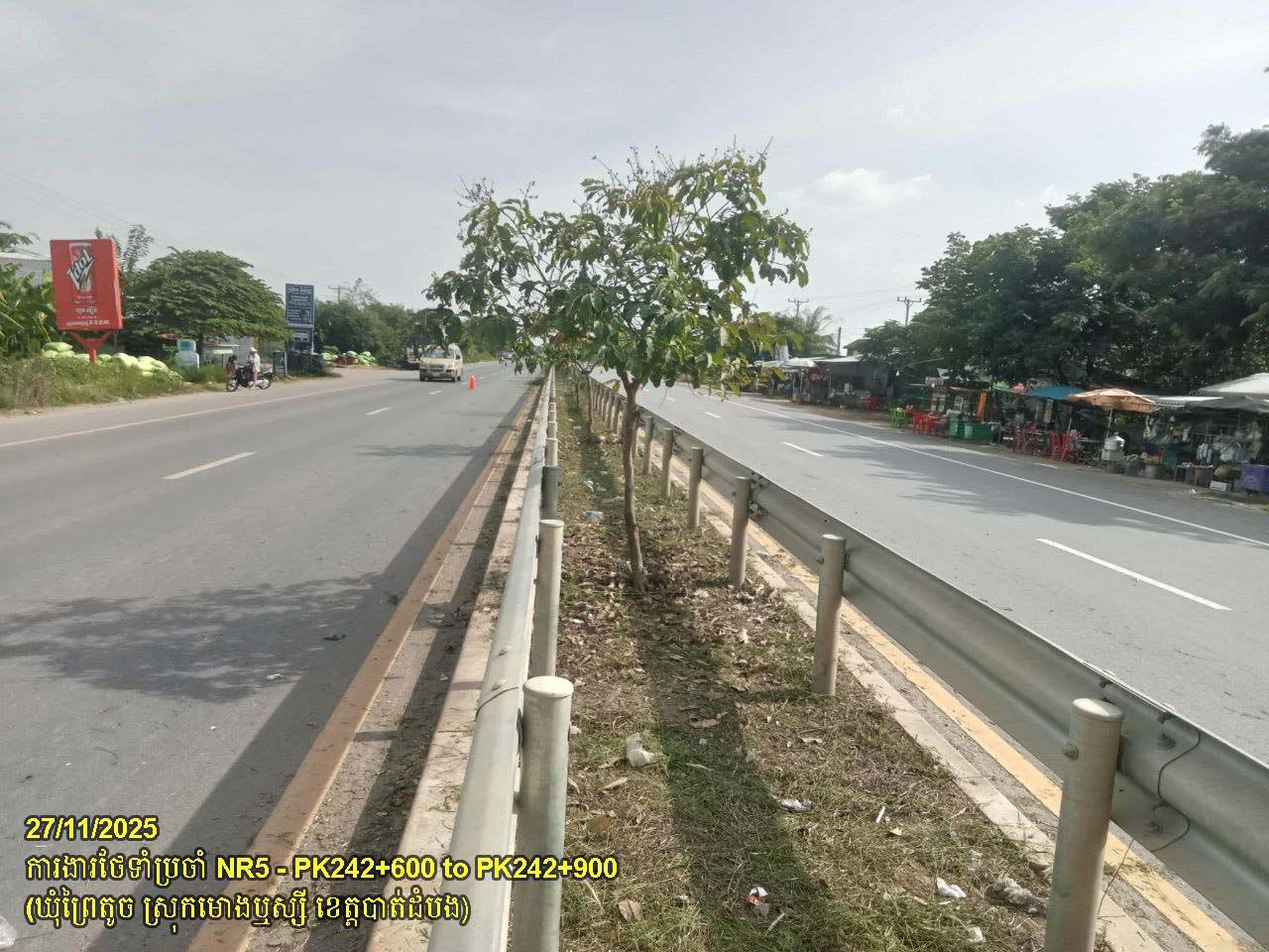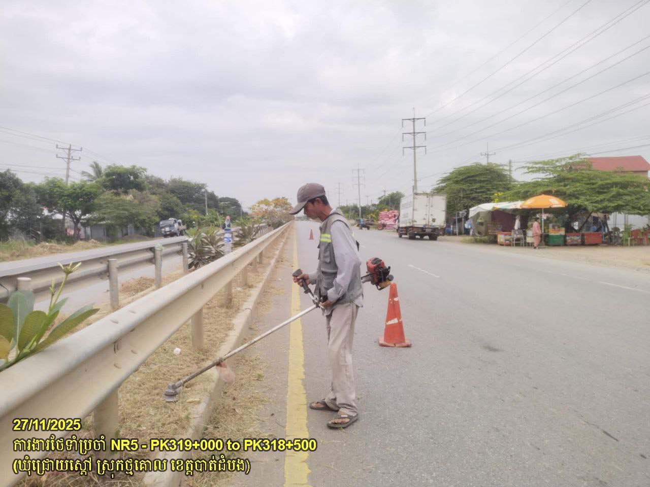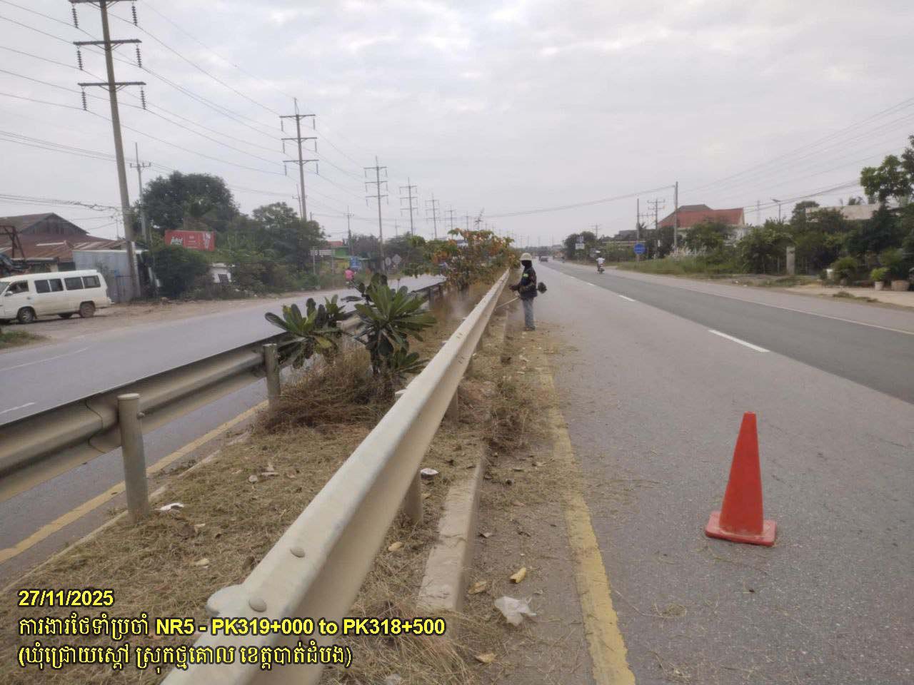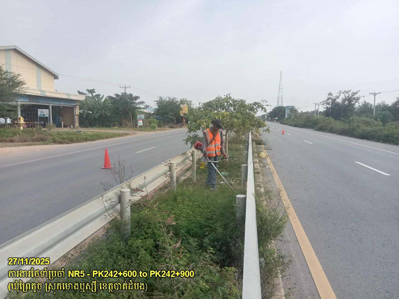 ៤. បន្តការងារថែទាំផ្លូវជាតិលេខ ៥ ៖ ការងារកាត់ឆ្ការព្រៃលើមេដ្យាន, និងសម្អាតកំទីធូលី សងខាងផ្លូវ ចន្លោះគ.ម២៤២+៦០០ ដល់គ.ម៣១៩+០០០ ស្ថិតនៅក្នុងស្រុកមោងឬស្សី និងស្រុកថ្មគោល ។