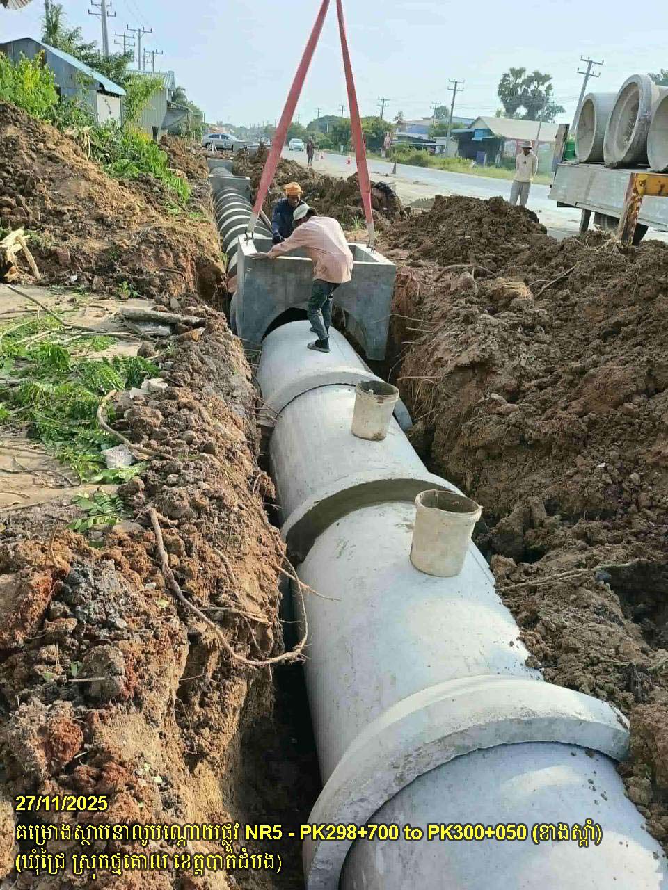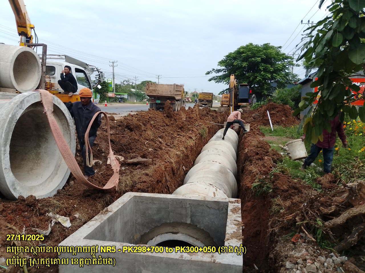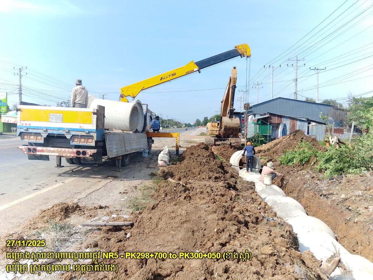 ១. បន្តការងារស្ថាបនាលូបណ្តោយផ្លូវជាតិលេខ ៥ ៖ ការងារកាយរណ្តៅដី បង្ហាប់គ្រឹះ និងតម្លើងលូមូលបណ្តោយផ្លូវ ចន្លោះពីគ.ម២៩៨+៧០០ ដល់គ.ម៣០០+០៥០ ស្ថិតនៅក្នុងឃុំជ្រៃ ស្រុកថ្មគោល ។