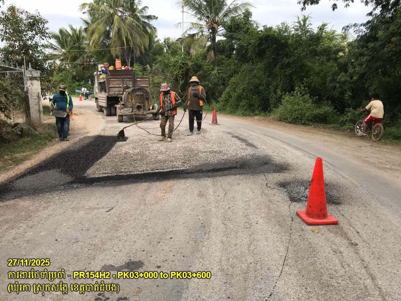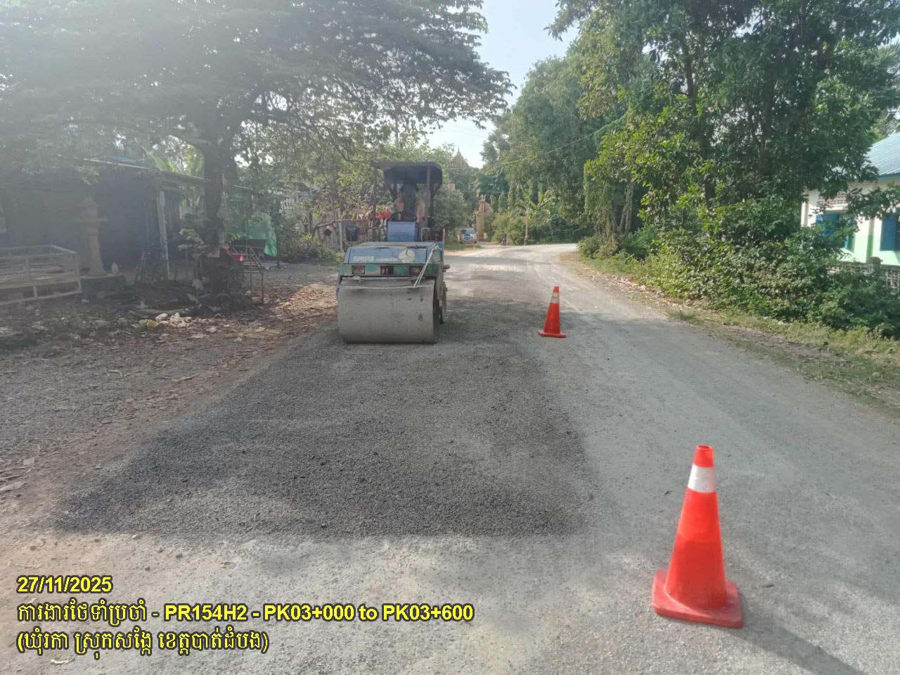 ៩. បន្តការងារថែទាំផ្លូវខេត្តលេខ ១៥៤H២ ៖ ការងារស្រោចកៅស៊ូជួសជុលផ្ទៃផ្លូវ ចន្លោះគ.ម០៣+០០០ ដល់គ.ម០៣+៦០០ ស្ថិតនៅក្នុងឃុំរកា ស្រុកសង្កែ។