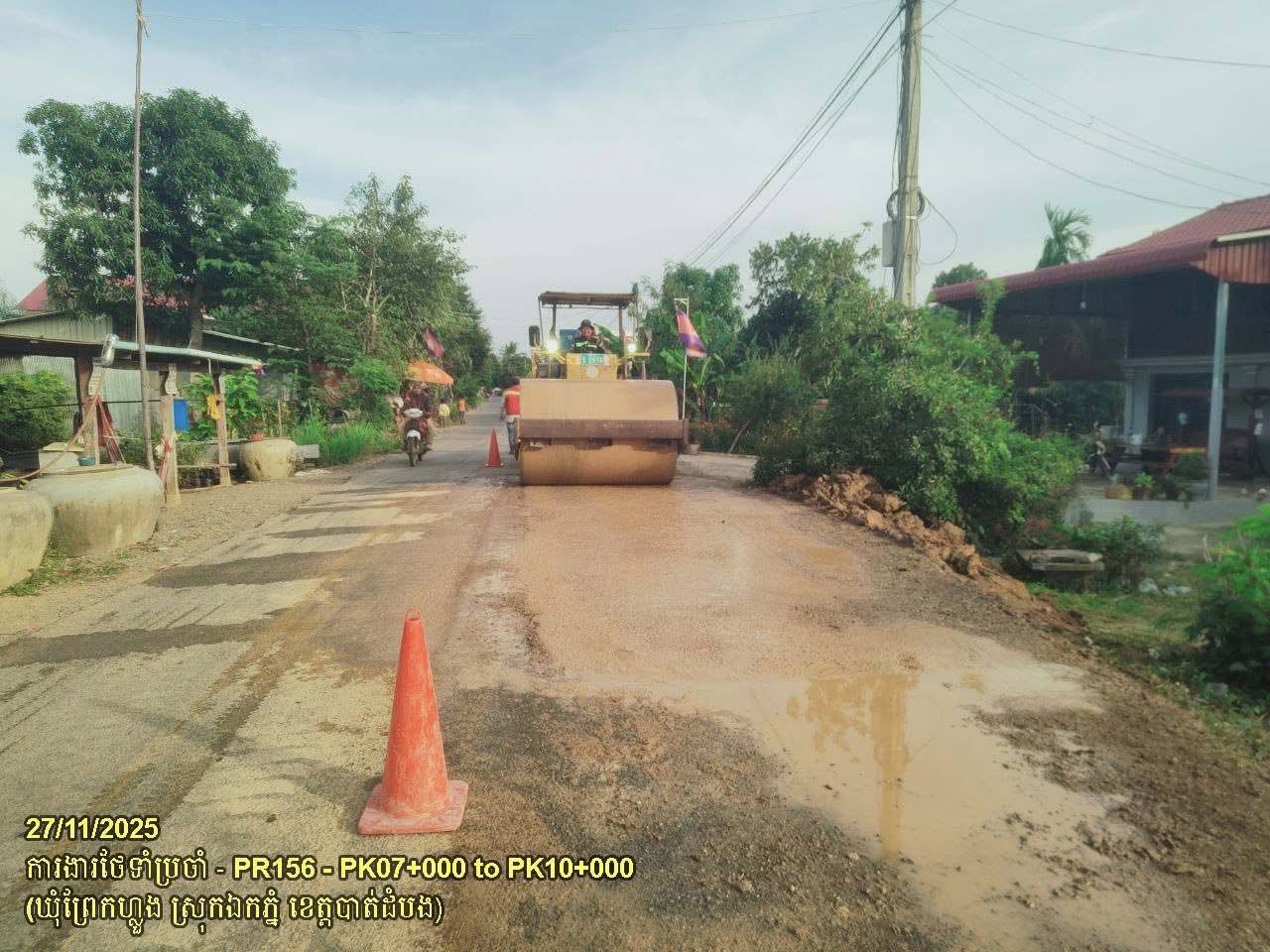 ១០. បន្តការងារថែទាំផ្លូវខេត្តលេខ ១៥៦ ៖ ការងារជួសជុលស្នាមផតស្រុត ដោយកាយដីគ្មានគុណភាព និងចាក់បំពេញថ្មម៉ិច រួចកៀរកិនបង្ហាប់ ចន្លោះគ.ម០៧+០០០ ដល់គ.ម១០+០០០ ស្ថិតនៅក្នុងឃុំព្រែកហ្លួង ស្រុកឯកភ្នំ។