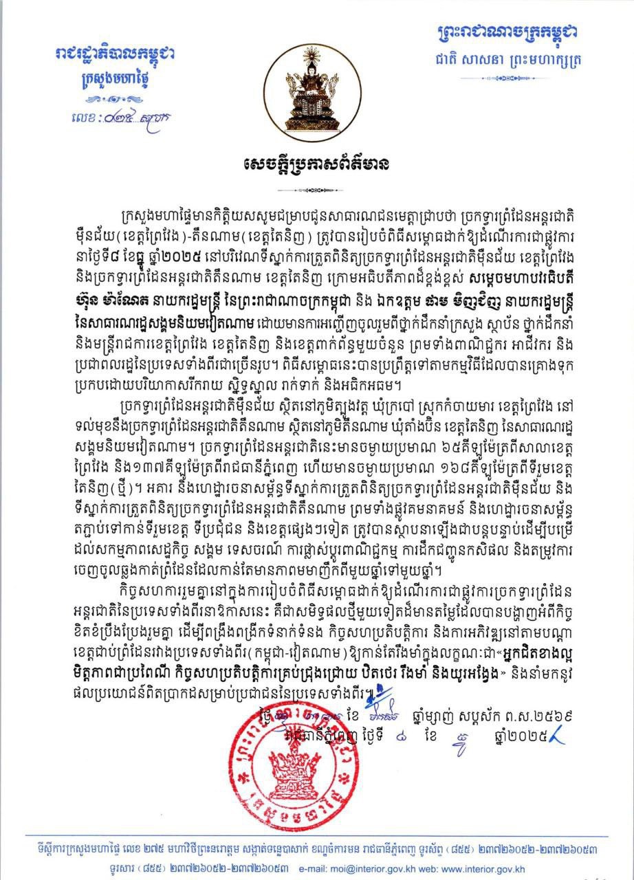 ក្រសួងមហាផ្ទៃ ចេញសេចក្តីប្រកាសព័ត៌មាន ស្តីអំពីការសម្ពោធដាក់ឱ្យដំណើរការជាផ្លូវការនូវច្រកទ្វារព្រំដែនអន្តរជាតិ ម៉ឺនជ័យ (ខេត្តព្រៃវែង)-តឹនណាម(ខេត្តតៃនិញ) ក្រោមអធិបតីភាពដ៏ខ្ពង់ខ្ពស់ សម្តេចមហាបវរធិបតី ហ៊ុន ម៉ាណែត នាយករដ្ឋមន្ត្រី នៃព្រះរាជាណាចក្រកម្ពុជា និងឯកឧត្តម ផាម មិញជិញ នាយករដ្ឋមន្ត្រី នៃសាធារណរដ្ឋសង្គមនិយមវៀតណាម។