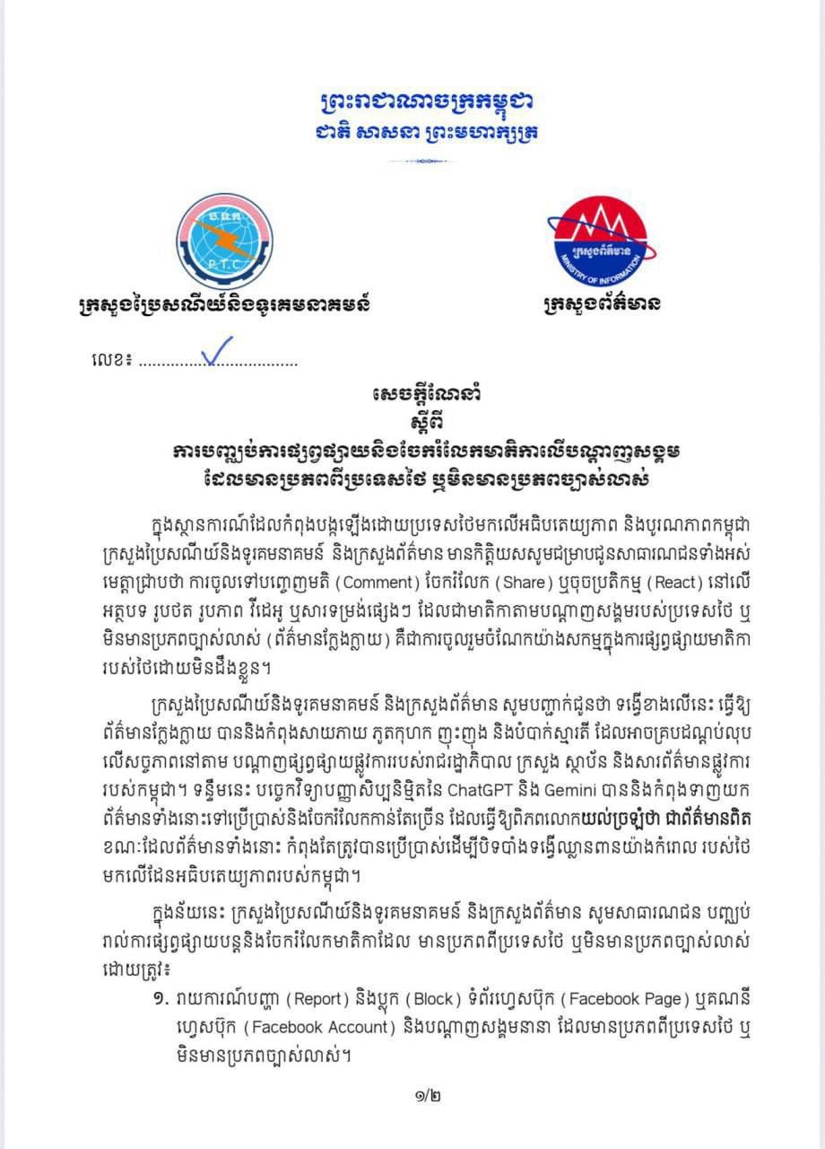 ព័ត៌មានជាតិ ក្រសួងប្រៃសណីយ៍ និងក្រសួងព័ត៌មាន៖ សូមឱ្យបញ្ឈប់ការផ្សព្វផ្សាយ និងចែករំលែកមាតិកាលើបណ្តាញសង្គម ដែលមានប្រភពពីប្រទេសថៃ ឬមិនមានប្រភពច្បាស់លាស់ Pann Phalla December 23, 2025 0 About the Author Pann Phalla Administrator Visit Website View All Posts Share Messenger Telegram Post Copy Share Post navigation Previous: រដ្ឋមន្រ្តីសុខាភិបាល ណែនាំ ៥ចំណុចសំខាន់ៗដល់មន្ត្រីក្រោមឱវាទ ឆ្លើយតបនឹងស្ថានភាពព្រំដែនកម្ពុជា-ថៃNext: កម្ពុជា-ថៃនឹងបើកកិច្ចប្រជុំវិសាមញ្ញនៅថ្ងៃទី២៤ ខែធ្នូ ឆ្នាំ២០២៥ស្អែកនេះ ដើម្បីពិភាក្សាអំពីការអនុវត្ត និងការផ្ទៀងផ្ទាត់បទឈប់បាញ់ Leave a Reply Cancel replyYour email address will not be published. Required fields are marked *Comment * Name * Email * Website Save my name, email, and website in this browser for the next time I comment. អត្ថបទជាប់ទាក់ទង ព័ត៌មានជាតិ សេចក្តីព្រាងច្បាប់ ស្តីពីការប្រឆាំងការឆបោកតាមប្រព័ន្ធបច្ចេកវិទ្យា និងសេចក្តីស្នើច្បាប់ ស្តីពីវិសោធនកម្មច្បាប់ ស្តីពីការបោះឆ្នោតជ្រើសតាំងសមាជិកព្រឹទ្ធសភា ត្រូវបានអនុម័ត Pann Phalla March 30, 2026 0 ព័ត៌មានជាតិ មកដឹងពីលក្ខខណ្ឌសំខាន់ៗសម្រាប់ការចុះឈ្មោះចូលរួមប្រកួតបាល់ទាត់ពានរង្វាន់ SOCCER LEAGUE លើកទី៩ ឆ្នាំ២០២៦ Pann Phalla March 30, 2026 0 ព័ត៌មានជាតិ រាជរដ្ឋាភិបាល ដាក់ចេញនូវវិធានការបន្ធូរបន្ថយបន្ទុកអាករលើតម្លៃបន្ថែម សម្រាប់ប្រេងសាំងធម្មតា និងប្រេងម៉ាស៊ូត ដោយបញ្ចុះពីអត្រា ១០% មកអត្រា ៤% (រដ្ឋទទួលបន្ទុកជំនួសចំនួន ៦%) Pann Phalla March 25, 2026 0