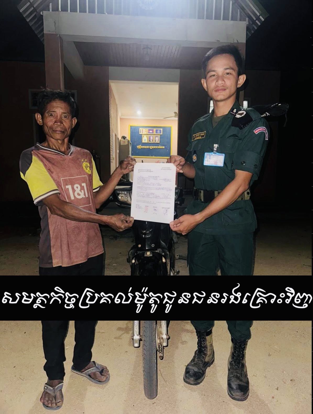 វត្ថុតាងដកហូត៖ ម៉ូតូចំនួន ០១គ្រឿង ម៉ាក Honda Dream C125 ពណ៌ខ្មៅ ស៊េរីឆ្នាំ២០១៨ ពាក់ផ្លាកលេខ កំពង់ស្ពឺ 1K-2052 សមត្ថកិច្ចបានប្រគល់ជូនជនរងគ្រោះដើម្បីបានប្រើប្រាស់វិញ។
