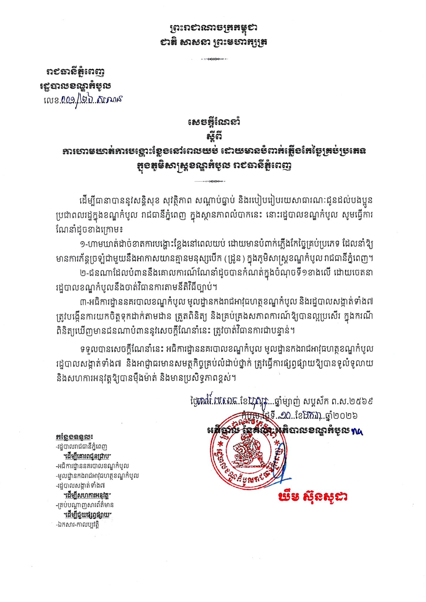 សេចក្តីណែនាំស្តីពីការហាមឃាត់ការបង្ហោះខ្លែងនៅពេលយប់ ដោយមានបំពាក់ភ្លើងកែច្នៃគ្រប់ប្រភេទ ក្នុងភូមិសាស្រ្តខណ្ឌកំបូល រាជធានីភ្នំពេញ។