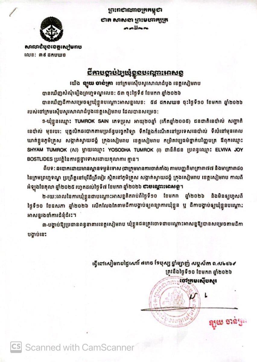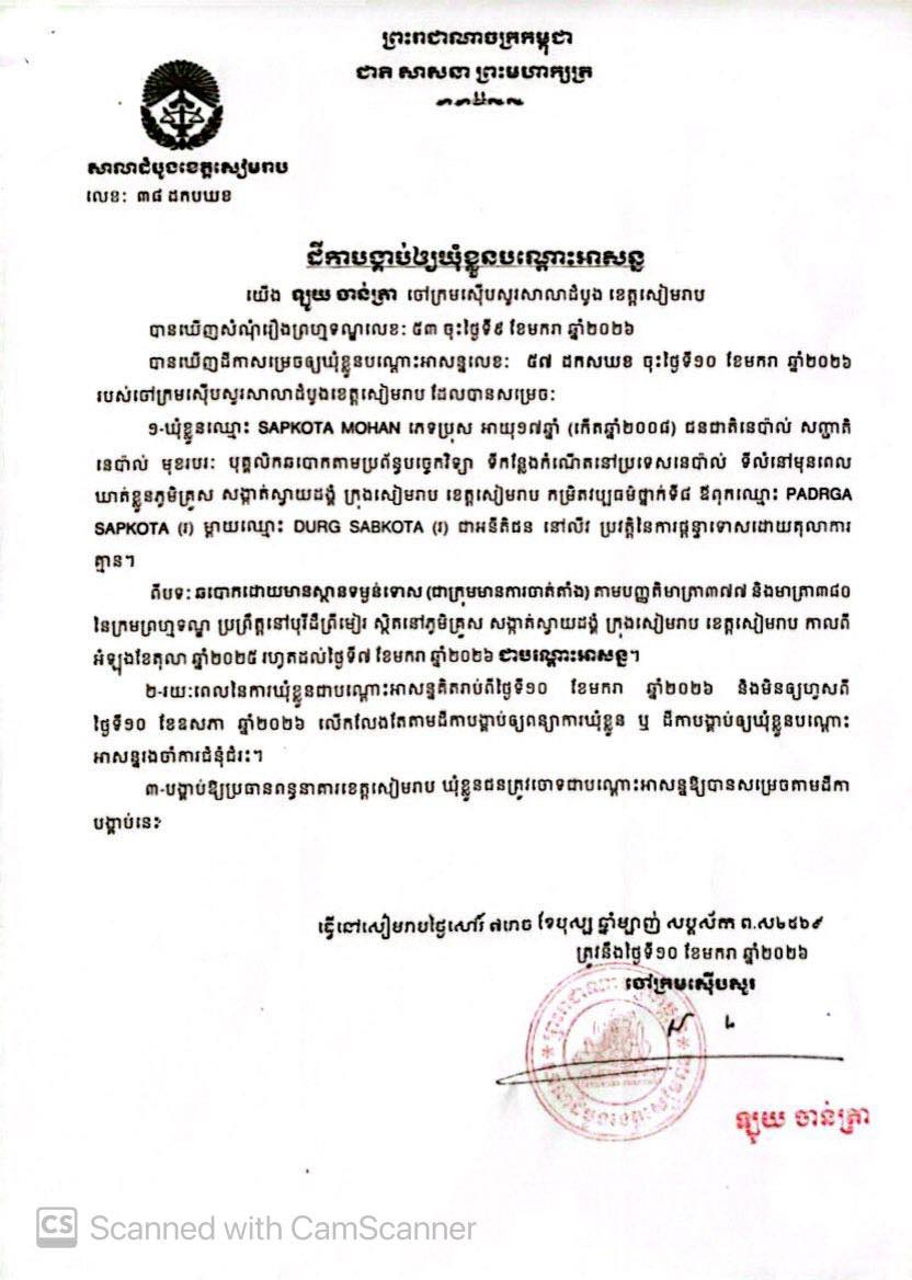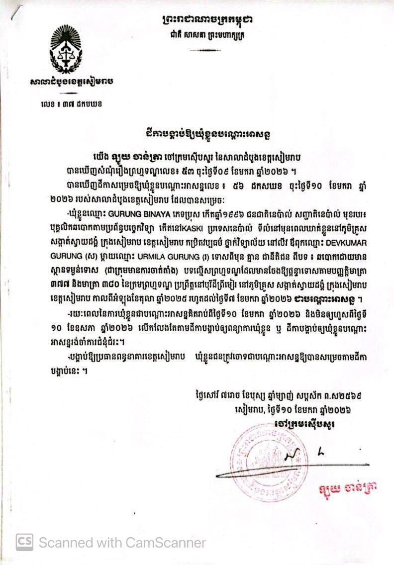(សៀមរាប)៖ បុរសជនជាតិនេប៉ាល់ចំនួន ០៣នាក់ ទី១ឈ្មោះ GURUNG BINAYA ទី២ឈ្មោះ TUMROK SAIN និងទី៣ឈ្មោះ SAPKOTA MOHAN ត្រូវបានសាលាដំបូងខេត្តសៀមរាប កាលពីថ្ងៃទី១០ ខែមករា ឆ្នាំ២០២៦ បង្គាប់ឱ្យឃុំខ្លួនបណ្តោះអាសន្ន ពីបទឆបោកមានស្ថានទម្ងន់ទោស ជាក្រុមមានការចាត់តាំង។