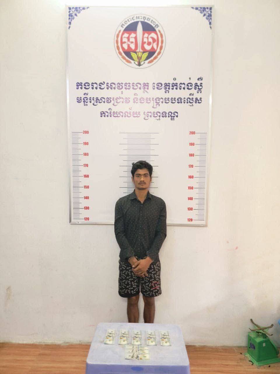 ភ្លាមៗនោះ កម្លាំងមូលដ្ឋានកងរាជអាវុធហត្ថស្រុកភ្នំស្រួច បានទៅដល់ទីតាំងកេីតហេតុ បានធ្វេីការឃាត់ខ្លួនជន សង្ស័យចំនួន ០១នាក់ ឈ្មោះ ប្រាក់ ម៉េងលី ភេទប្រុស អាយុ ២៦ឆ្នាំ មុខរបមិនពិតប្រាកដ ស្នាក់នៅភូមិឃុំខាងលើ មានទីលំនៅកំណើតភូមិជ័យសេនា ឃុំតាកែន ស្រុកឈូក ខេត្តកំពត។