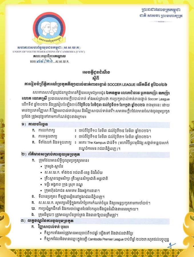 (ភ្នំពេញ)៖ ដើម្បីជំរុញឱ្យការប្រកួតប្រព្រឹត្តទៅដោយរលូន និងមានតម្លាភាព គណៈកម្មការរៀបចំការប្រកួតបាល់ទាត់ពានរង្វាន់ SOCCER LEAGUE បានចេញសេចក្តីប្រកាសណែនាំអំពីលក្ខខណ្ឌនៃការចុះឈ្មោះសម្រាប់បណ្តាក្លឹប និងសមាគមកីឡាបាល់ទាត់ដែលបំណងចូលរួមប្រកួត។