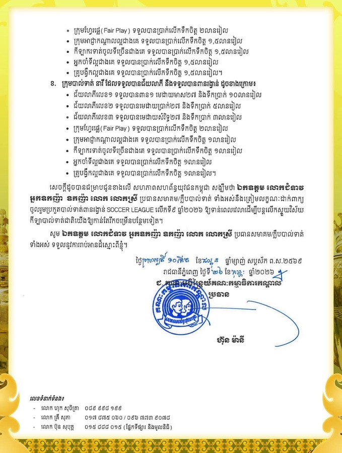 ជាចុងក្រោយ គណៈកម្មការរៀបចំបានរំលឹកដល់គ្រប់ក្រុមសមាគម និងក្លឹបទាំងអស់ ត្រូវយកចិត្តទុកដាក់ខ្ពស់ចំពោះបញ្ជីឈ្មោះកីឡាករ ដោយត្រូវធានាថាគ្មានកីឡាករណាម្នាក់ស្ថិតក្នុងបញ្ជីហាមឃាត់ ដូចដែលបានចែងក្នុងលក្ខខណ្ឌចូលរួមប្រកួតនោះឡើយ៕